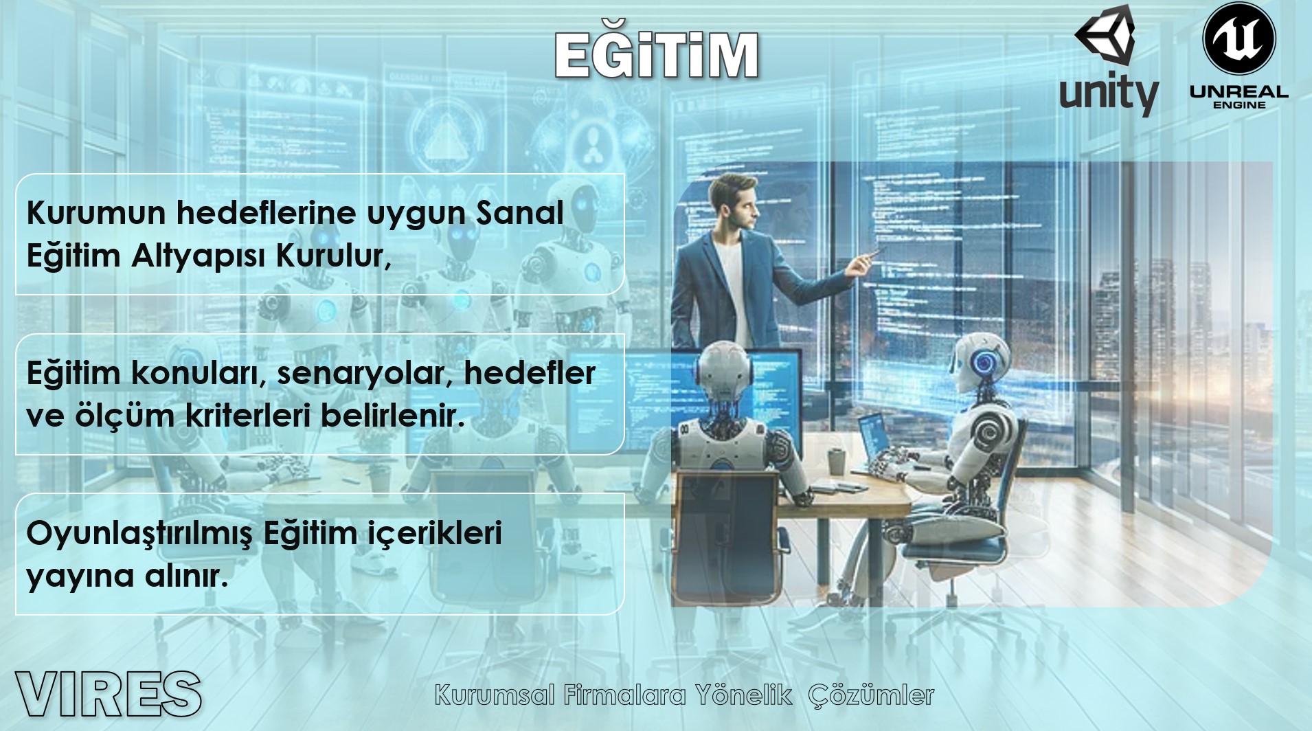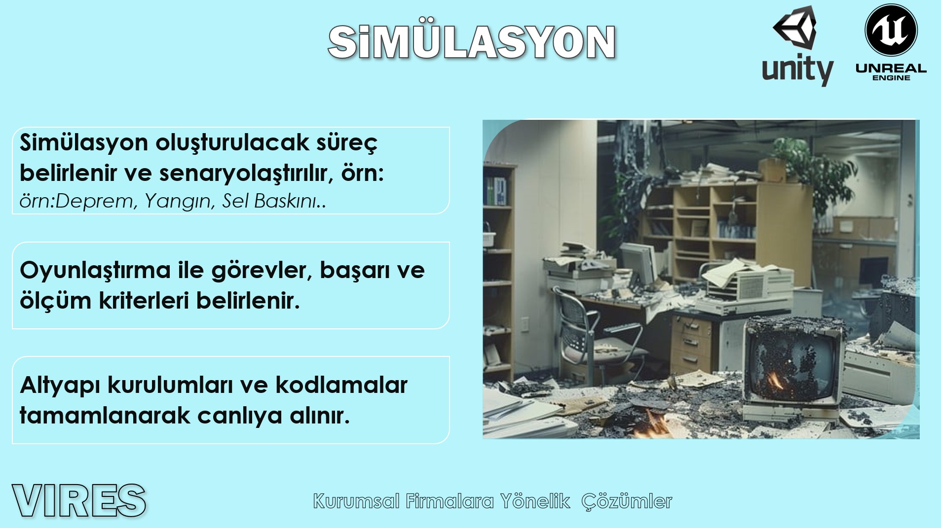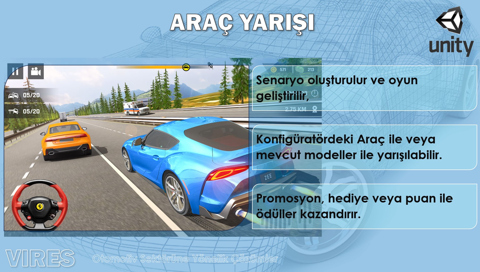 Oyun motorlarını kullanarak Sektöre özel çözümlerin yanı sıra, müşteri özelinde uygulamalar geliştiriyoruz. Uygulamalarımız Masaüstü ve Mobil Cihazlarda aplikasyon olarak çalışabildiği gibi, Web GL Streaming Bulut Altyapılarında Web uygulaması olarak mevcut web sayfalarınıza entegre olabilmektedir.