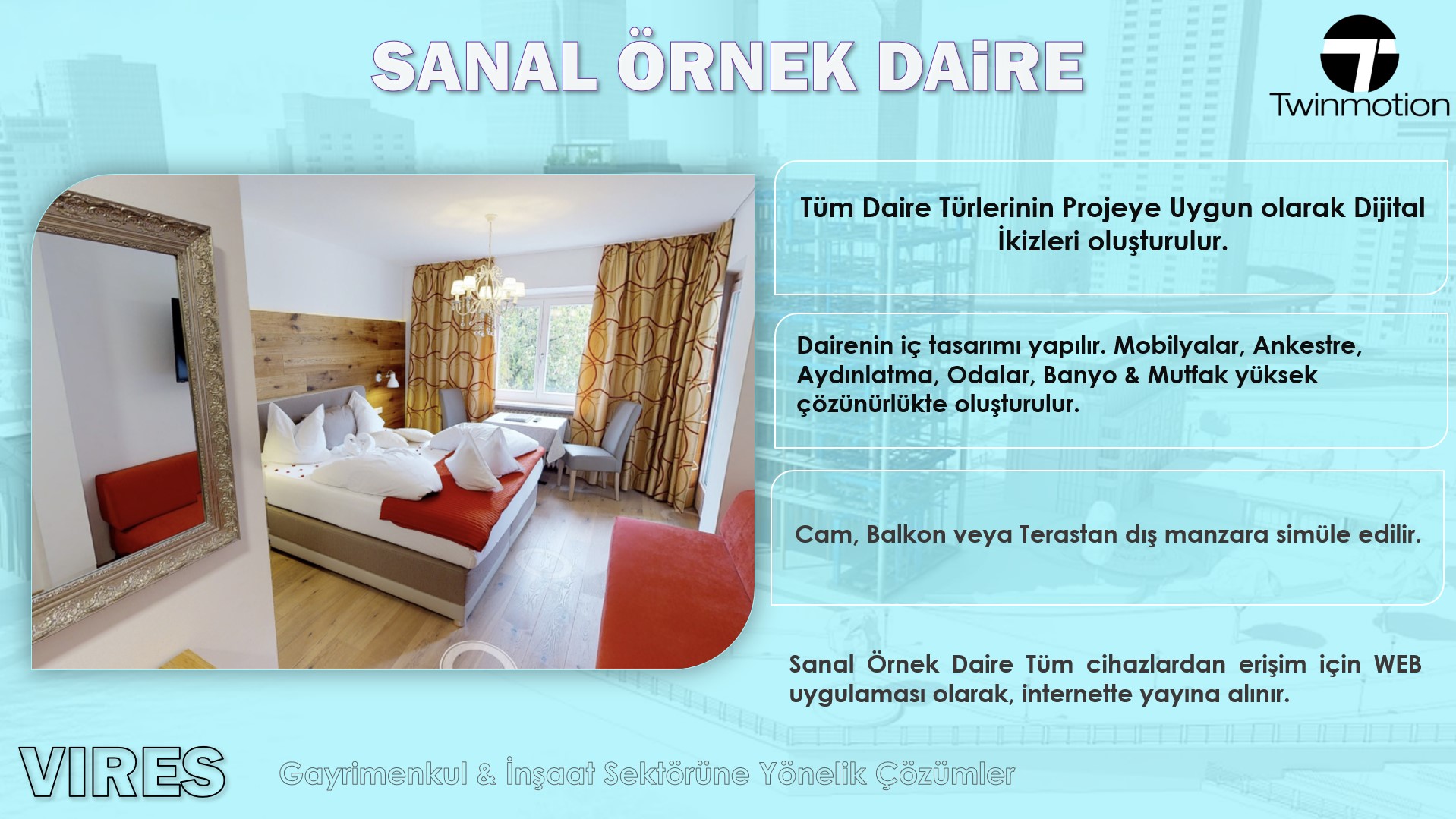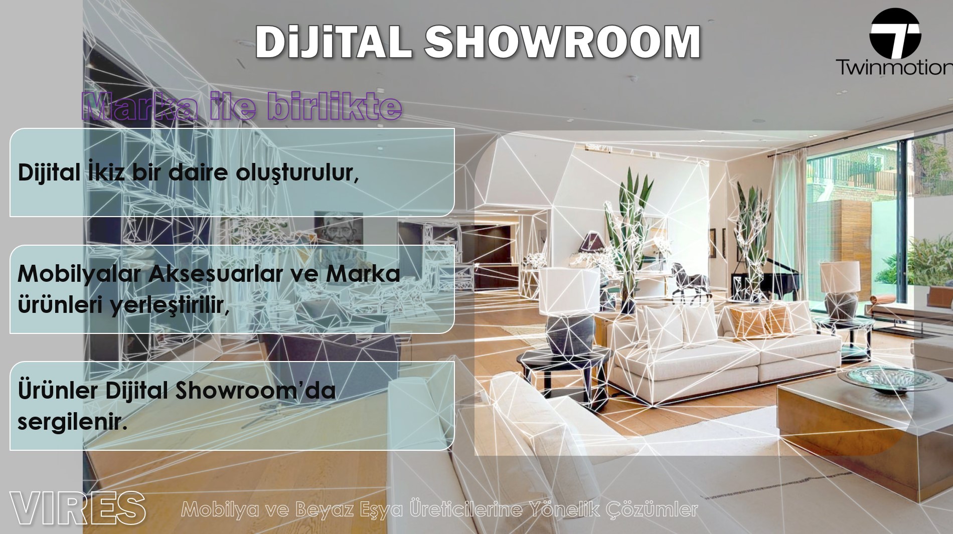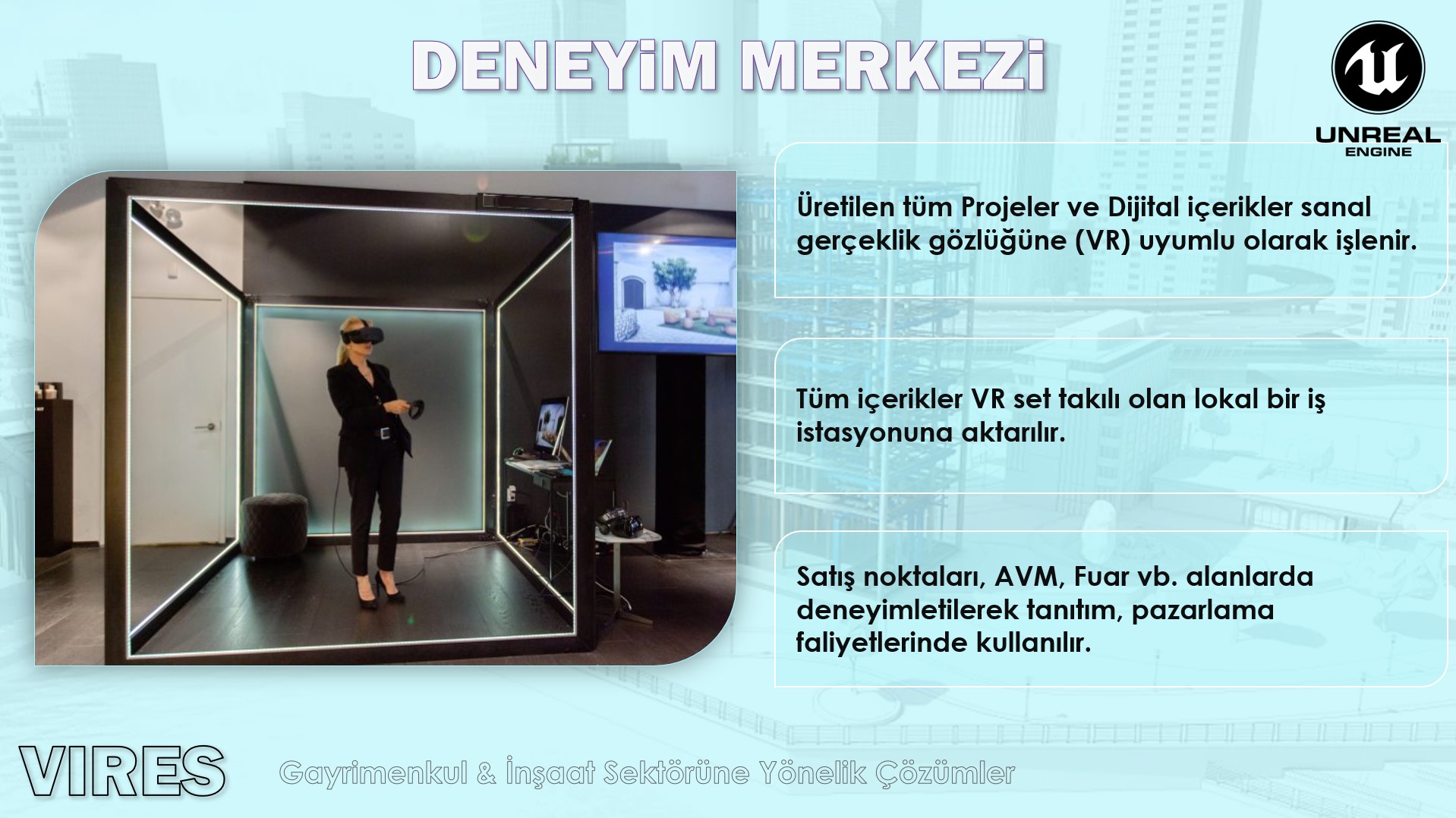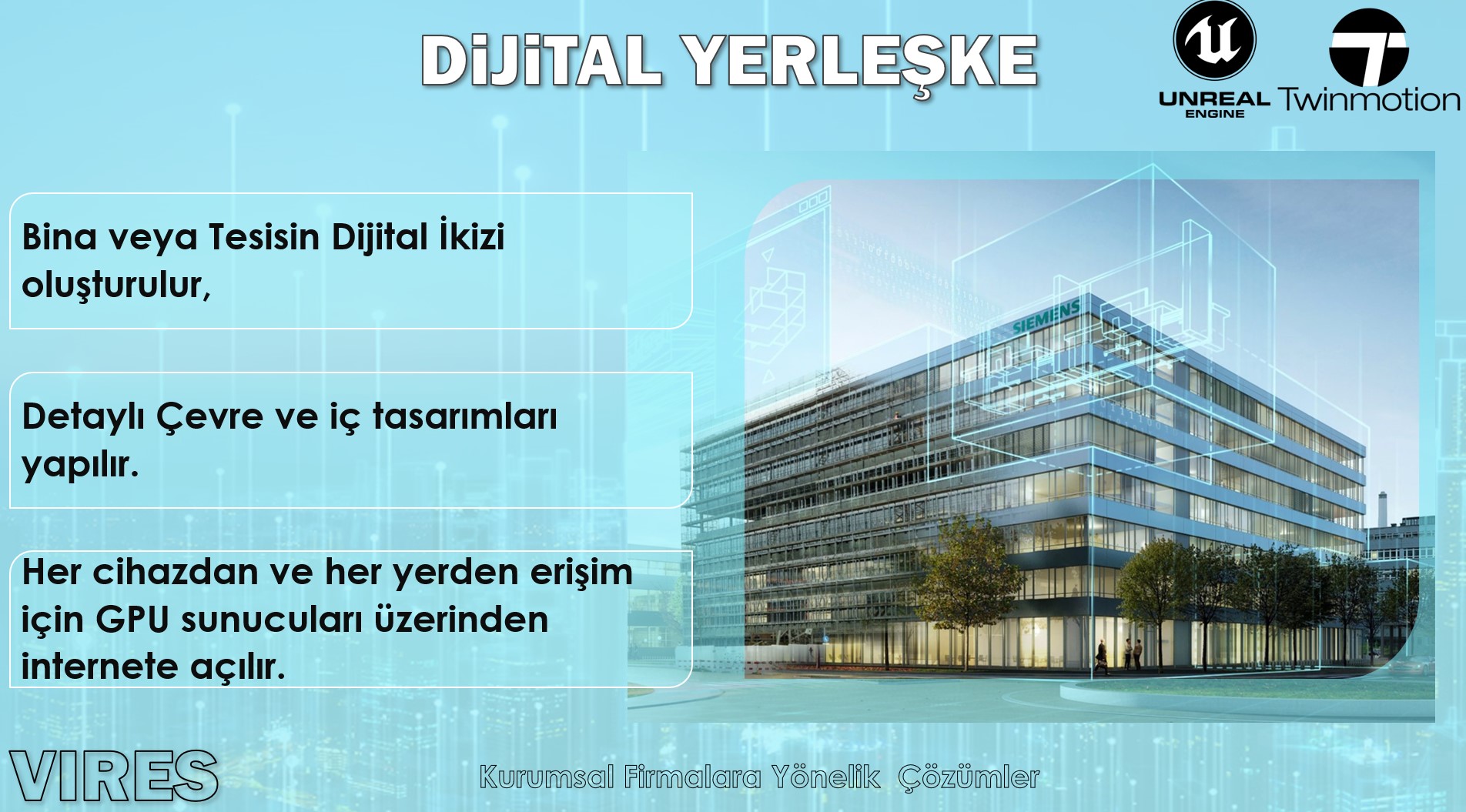 Oyun motorlarını kullanarak Sektöre özel çözümlerin yanı sıra, müşteri özelinde uygulamalar geliştiriyoruz. Uygulamalarımız Masaüstü ve Mobil Cihazlarda aplikasyon olarak çalışabildiği gibi, Web GL Streaming Bulut Altyapılarında Web uygulaması olarak mevcut web sayfalarınıza entegre olabilmektedir.